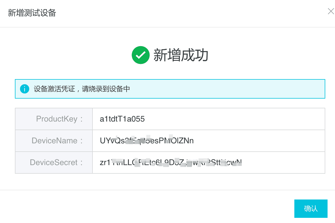 设备添加成功后,会生成对应的激活凭证,设备连接到云端需要使用,可以理解是设备在云端的唯一标识符。
