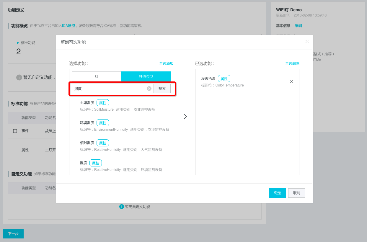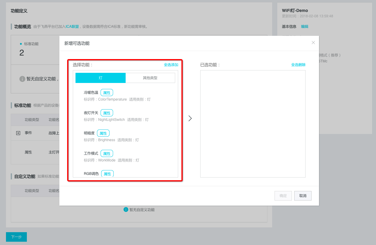 点击“新增”,可以查看和选择“可选功能”。以灯为例,可以选择灯的功能,也可以搜索跨品类的功能: