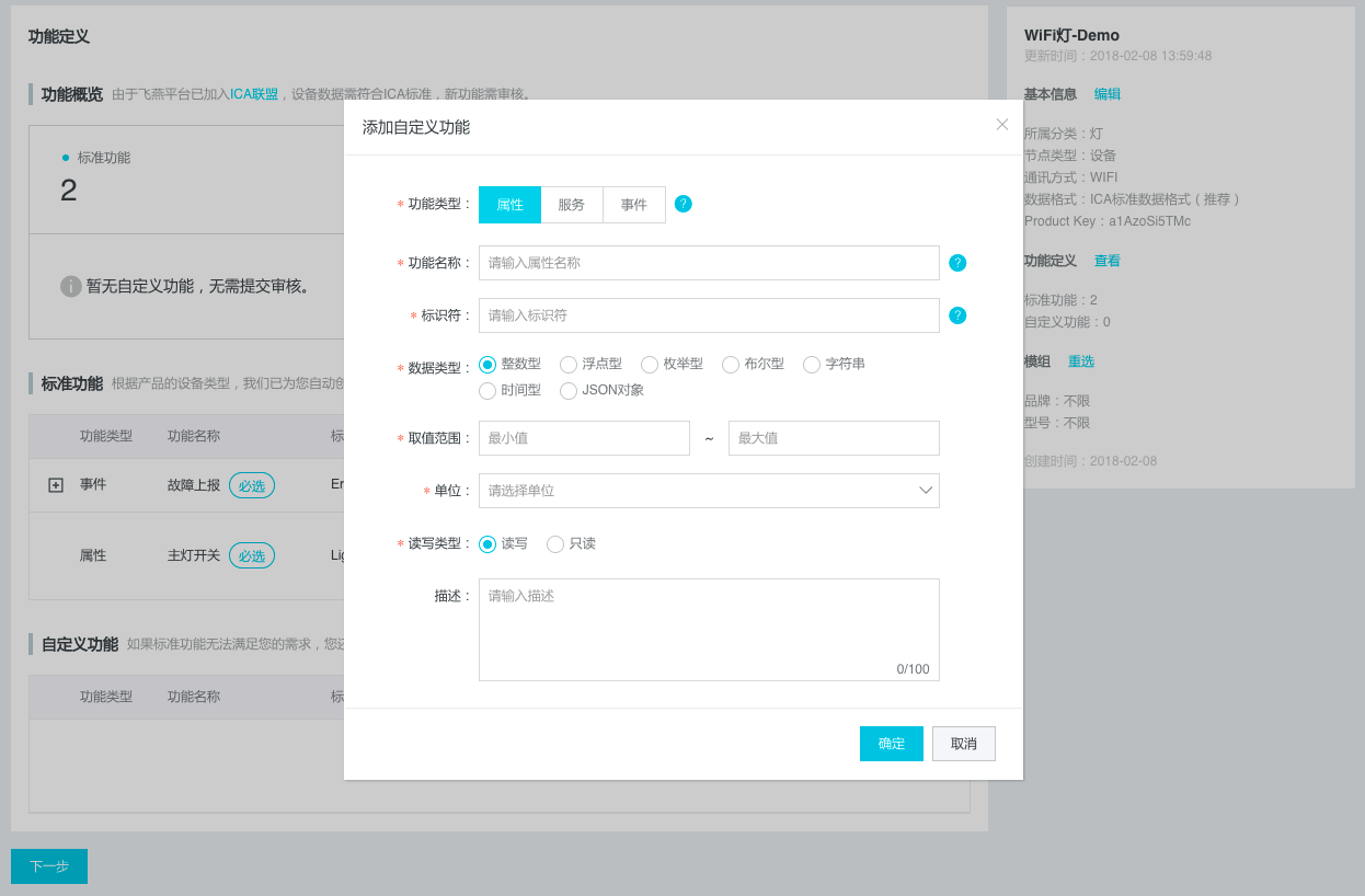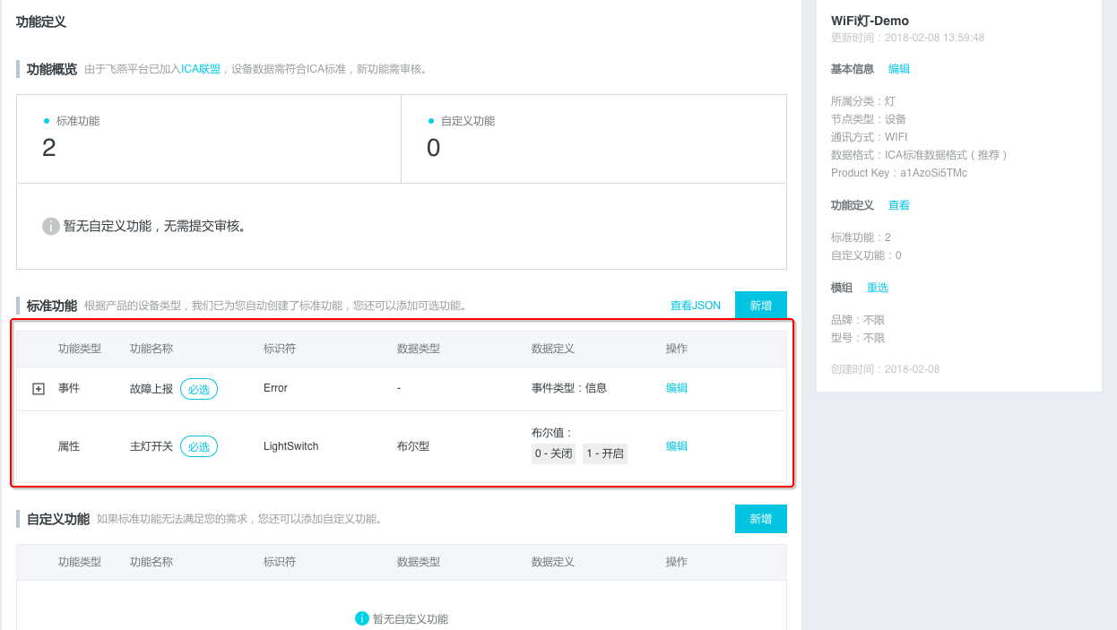 功能定义完成后,平台能够根据“标准功能” 和(通过审核后)“自定义功能”,自动生成一份Json格式的TSL。