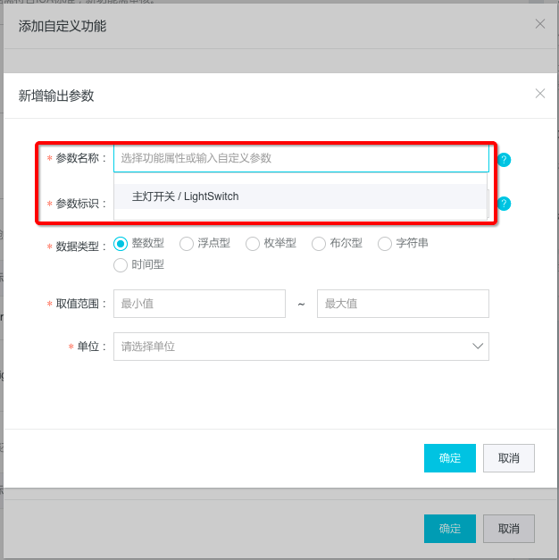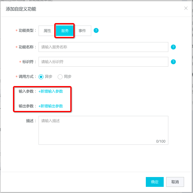 服务适用于较复杂的设备功能,比如需要带入参和出参。点击“新增输入参数”,在弹窗中添加服务的输入/输出参数,您可以选择将产品下的某个属性直接作为参数,也可以完全自定义一个新的参数。单个服务最多可分别添加10个入参或10个出参。